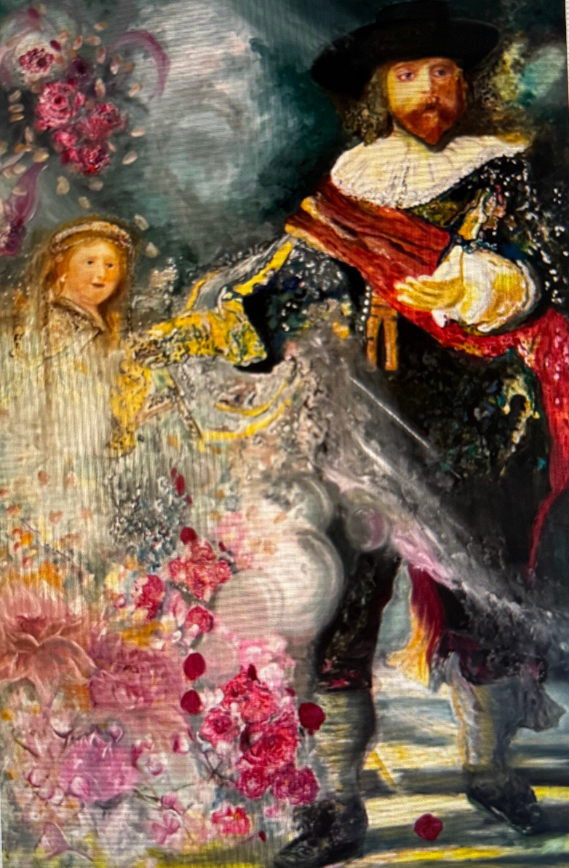 Het meisje straalt licht en onschuld uit, terwijl de beweging rondom haar een dromerige, bijna magische sfeer creëert. De commandant behoudt zijn statigheid, maar is opgenomen in een wereld vol kleur, symboliek, bloemen en moderne verfijning.
